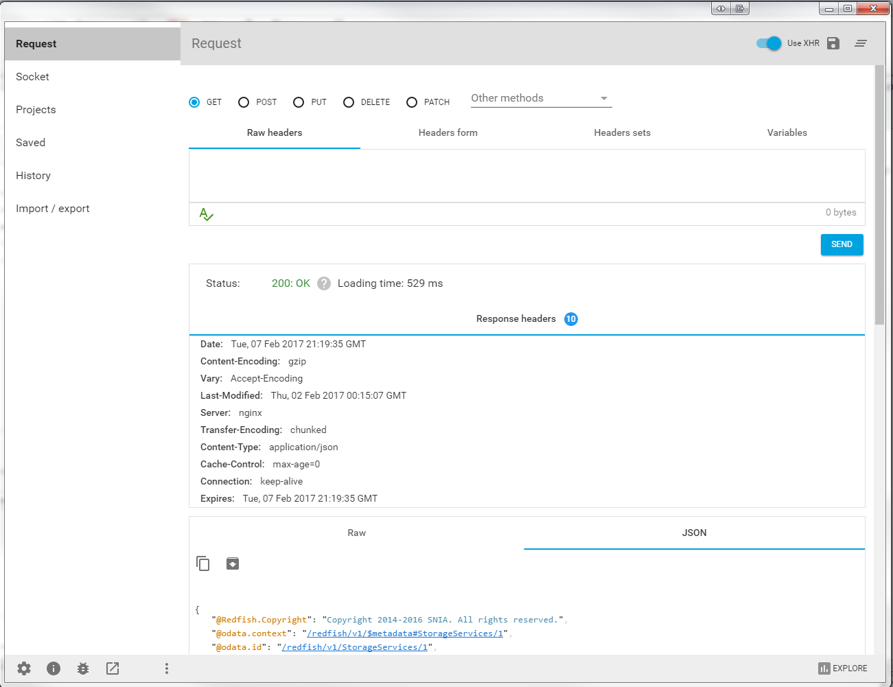 1. Launch Advanced REST client. Navigate to /redfish/v1/
