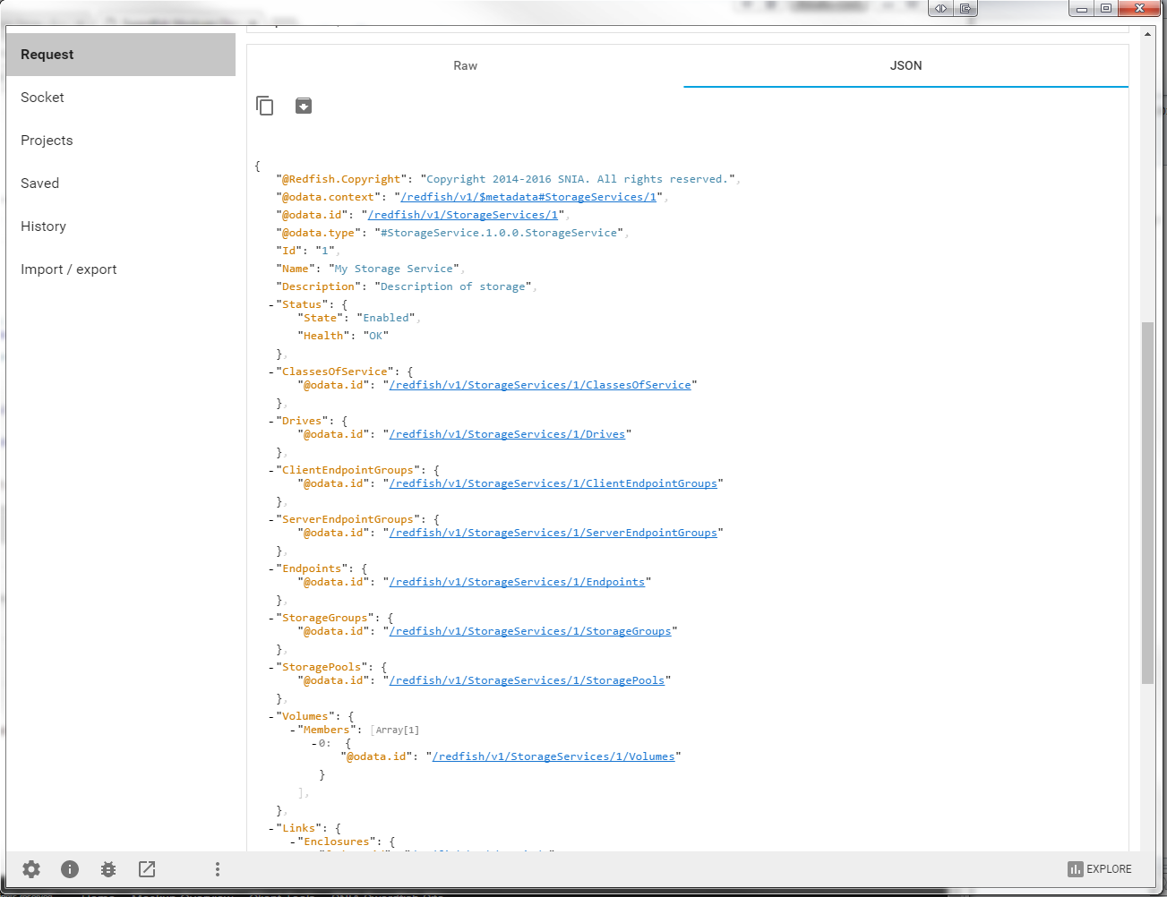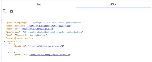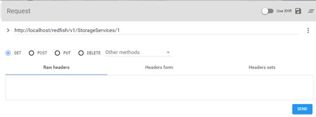 3. Clicking on /redfish/v1/StorageServices/1/ will insert the string to the URL field
